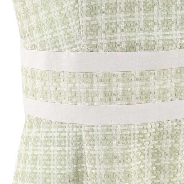 着るだけで華やかさをプラスしてくれる、チェック柄のレース素材を活かしたフレンチスリーブワンピース。首元から胸元、ウエストのラインデザインがアクセントです。前身頃にはくるみボタンあしらい、可愛らしさをプラスしました。スカートは広がりすぎないフレアシルエットで、すっきりとした上品な印象に。膝が隠れる上品な長さで、ヒールでもフラットシューズでもバランス良く見える丈感にこだわりました。ウエスト位置が高めでスタイルアップも叶います。