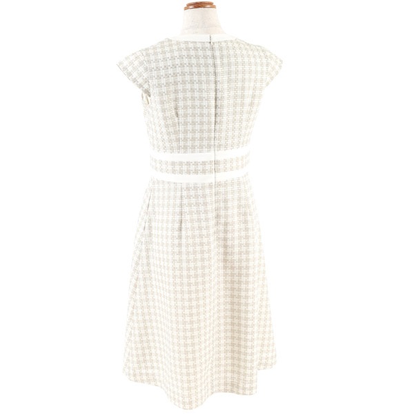 着るだけで華やかさをプラスしてくれる、チェック柄のレース素材を活かしたフレンチスリーブワンピース。首元から胸元、ウエストのラインデザインがアクセントです。前身頃にはくるみボタンあしらい、可愛らしさをプラスしました。スカートは広がりすぎないフレアシルエットで、すっきりとした上品な印象に。膝が隠れる上品な長さで、ヒールでもフラットシューズでもバランス良く見える丈感にこだわりました。ウエスト位置が高めでスタイルアップも叶います。
