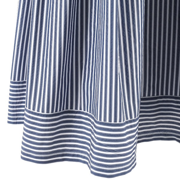 ウエストベルトと首まわり、裾部分の切替がポイントのワンピース。ストライプ生地を活かしたシンプルなデザインに、柄の向きを変えた切り替えでメリハリをプラスしました。袖は肩を自然にカバーできるフレンチスリーブ。スカートにはたっぷりタックを入れ、ボリューム感がありながら、広がりすぎないすっきりとしたシルエットに仕上げました。丈は膝がしっかり隠れる長さで、上品な印象に。高め位置でのウエストマークはスタイルアップ効果も。両サイドにポケットが付いています。