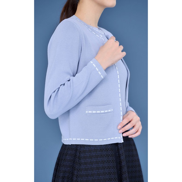首元や裾、袖口などに施したステッチ風デザインがポイントのニットカーディガン。着回ししやすいシンプルなデザインに、配色のステッチデザインがアクセントになっています。ジップアップデザインで程よいカジュアル感ありながら、上品な印象に仕上げました。ショート丈のコンパクトなシルエットで、羽織としてはもちろん、一枚での着用もおすすめ。配色プルオーバー(KH0841)とのアンサンブルでの着用も可能です。