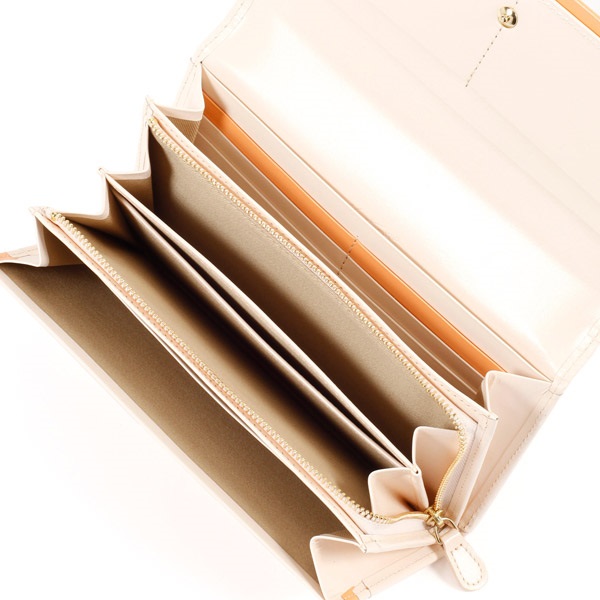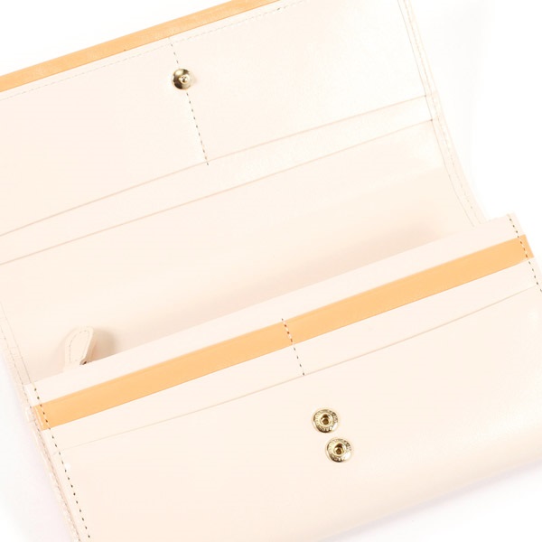 ツヤとハリのある牛革でお作りした長財布。すっきりとしたフォルムが上品な印象です。「KITAMURA MOTOMACHI」の文字に囲まれたKマークの飾りがポイント。かぶせの下と、カード段の一部にアクセントカラーをプラスしました。カード段やポケットなど収納スペースが充実しており、小銭入れは大きく開くL字タイプです。