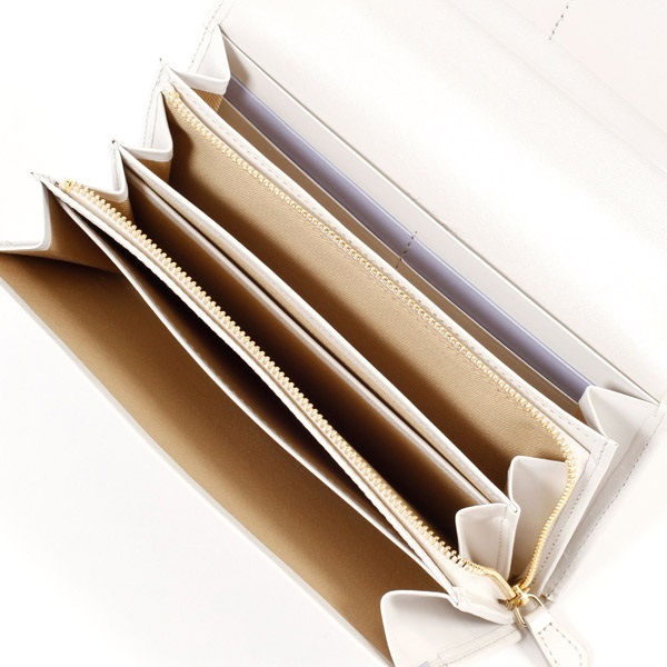 ツヤとハリのある牛革でお作りした長財布。すっきりとしたフォルムが上品な印象です。「KITAMURA MOTOMACHI」の文字に囲まれたKマークの飾りがポイント。かぶせの下と、カード段の一部にアクセントカラーをプラスしました。カード段やポケットなど収納スペースが充実しており、小銭入れは大きく開くL字タイプです。