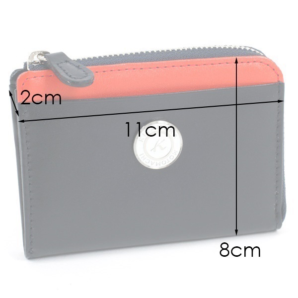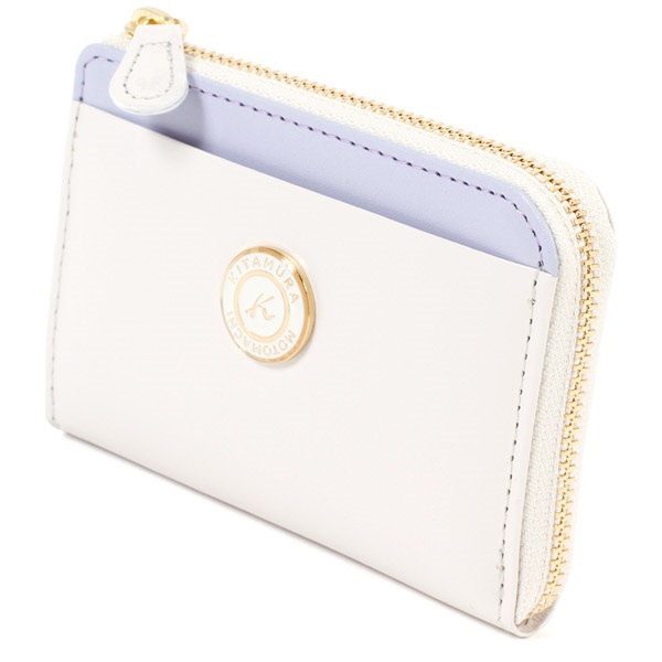 ツヤとハリのある牛革でお作りした小銭入れ。表面の一部にアクセントカラーをプラスしました。L字ファスナーのすっきりとしたフォルムが上品な印象です。「KITAMURA MOTOMACHI」の文字に囲まれたKマークの飾りがポイント。カードも収納でき、コンパクトなお財布としてもおすすめです。