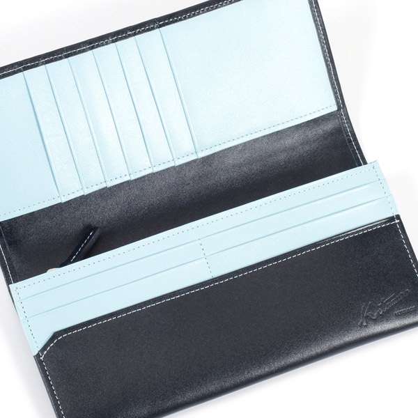 ツヤのあるスムース牛革でお作りした、シンプルなかぶせ型長財布。手触りが良く、しっとりとした質感が特徴です。カード段の遊び心ある配色がさりげないオシャレ感をプラス。薄マチながら収納スペースが充実し、カードもたくさん入ります。レシートやチケットを入れられるポケットも便利です。