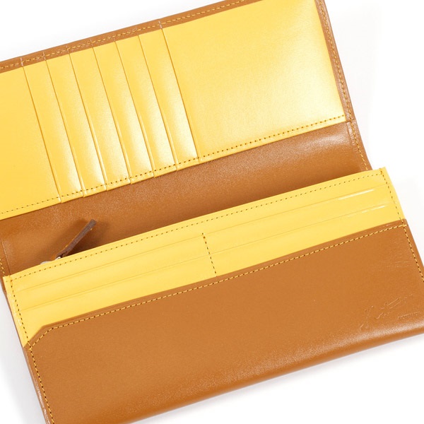 ツヤのあるスムース牛革でお作りした、シンプルなかぶせ型長財布。手触りが良く、しっとりとした質感が特徴です。カード段の遊び心ある配色がさりげないオシャレ感をプラス。薄マチながら収納スペースが充実し、カードもたくさん入ります。レシートやチケットを入れられるポケットも便利です。