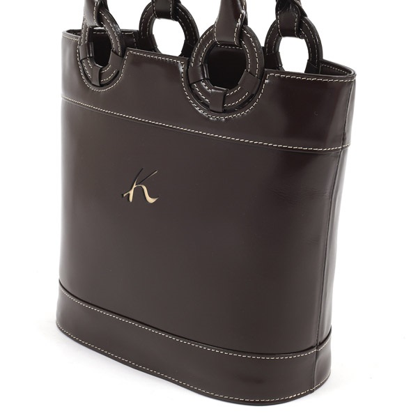 持ち手付け根のリングデザインがポイントのハンドバッグ。上品な光沢感のある牛革を使用しています。ほどよい縦長のフォルムは膝に置いたときに収まりが良く、普段使いしやすいサイズ感です。500mlのペットボトルが収まる高さで、内装の仕切りはポケットとしてもお使いいただけます。きれいめからカジュアルまで、幅広いコーディネートにおすすめです。