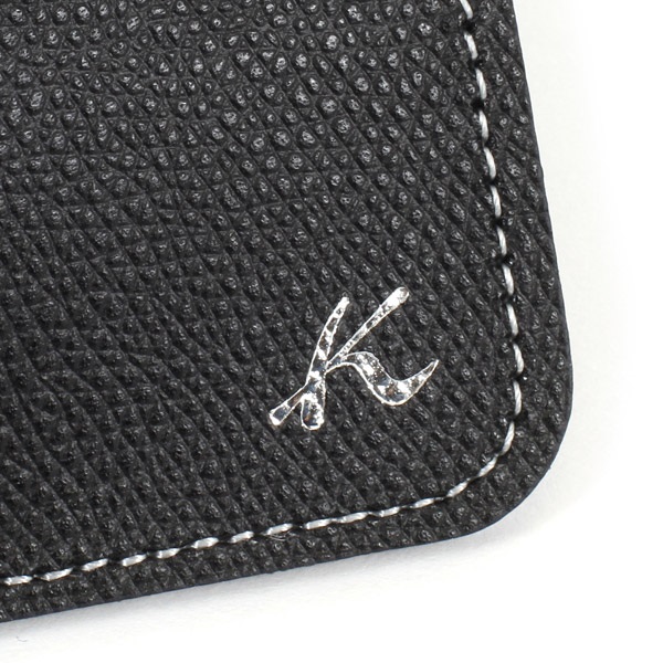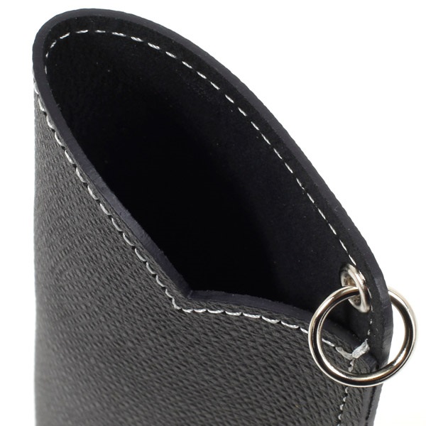 カーブの口元と、キラッと光る箔押しKマークがポイントのメガネケース。本体色によって、素材や仕上げによる質感、箔押しの色が異なります。上部に丸カンが付いており、リールホルダーやネックピースと組み合わせれば、バッグの持ち手や首にぶら下げてお使いいただけます。