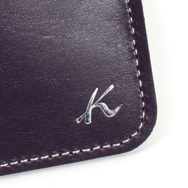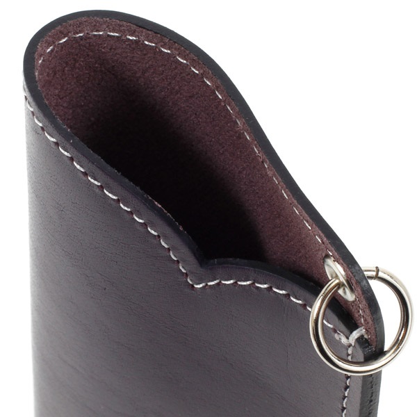 カーブの口元と、キラッと光る箔押しKマークがポイントのメガネケース。本体色によって、素材や仕上げによる質感、箔押しの色が異なります。上部に丸カンが付いており、リールホルダーやネックピースと組み合わせれば、バッグの持ち手や首にぶら下げてお使いいただけます。