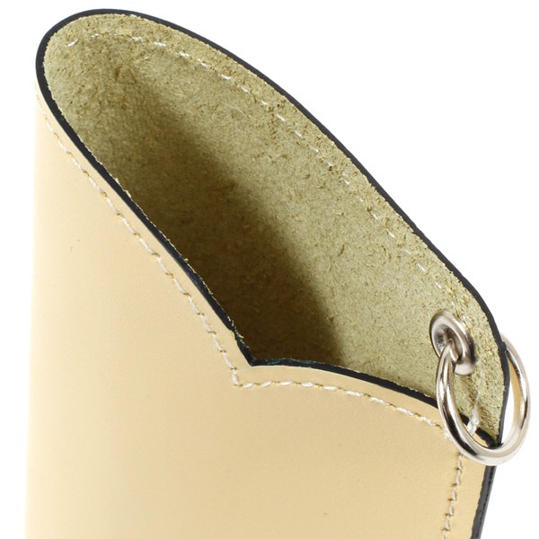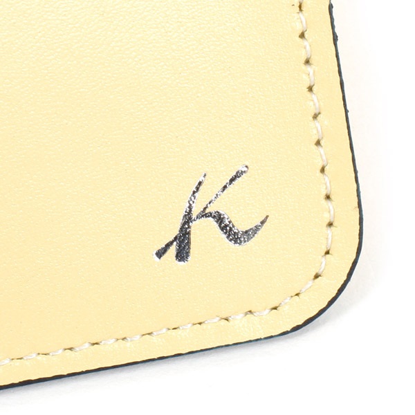 カーブの口元と、キラッと光る箔押しKマークがポイントのメガネケース。本体色によって、素材や仕上げによる質感、箔押しの色が異なります。上部に丸カンが付いており、リールホルダーやネックピースと組み合わせれば、バッグの持ち手や首にぶら下げてお使いいただけます。