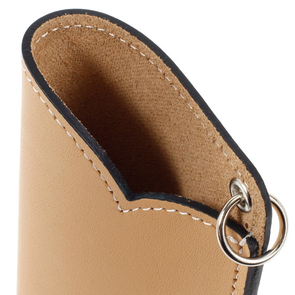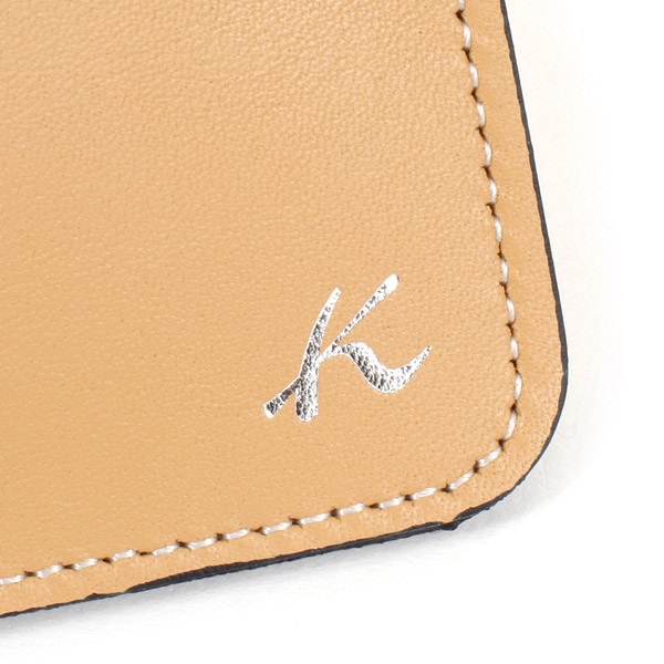 カーブの口元と、キラッと光る箔押しKマークがポイントのメガネケース。本体色によって、素材や仕上げによる質感、箔押しの色が異なります。上部に丸カンが付いており、リールホルダーやネックピースと組み合わせれば、バッグの持ち手や首にぶら下げてお使いいただけます。