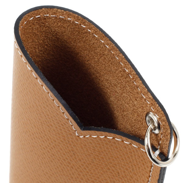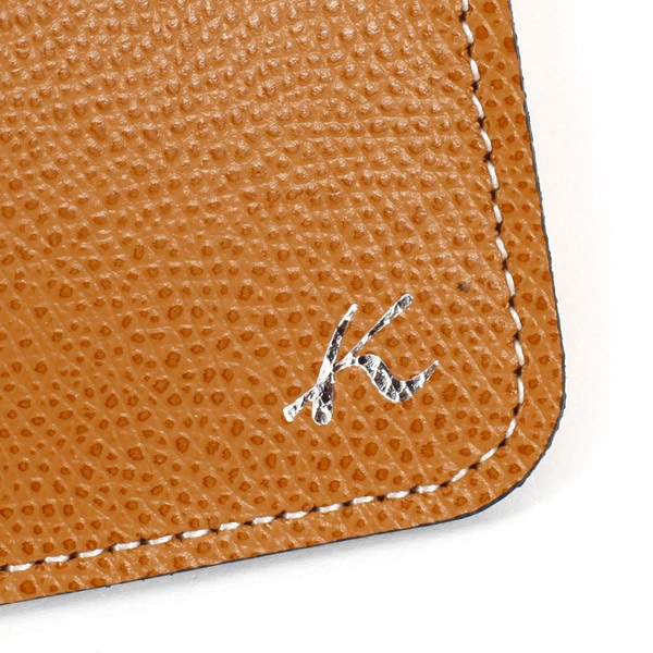 カーブの口元と、キラッと光る箔押しKマークがポイントのメガネケース。本体色によって、素材や仕上げによる質感、箔押しの色が異なります。上部に丸カンが付いており、リールホルダーやネックピースと組み合わせれば、バッグの持ち手や首にぶら下げてお使いいただけます。