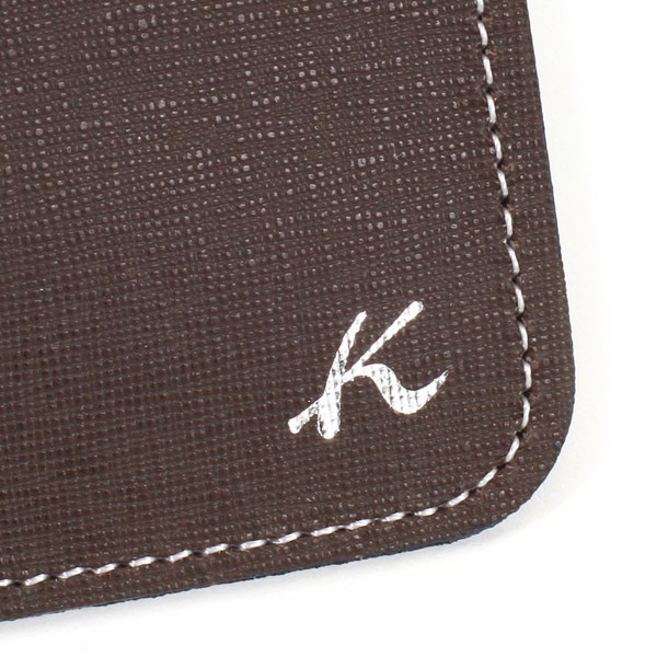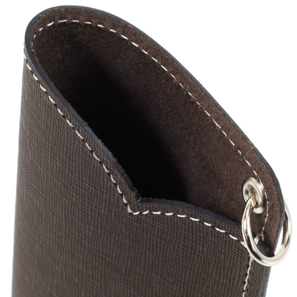 カーブの口元と、キラッと光る箔押しKマークがポイントのメガネケース。本体色によって、素材や仕上げによる質感、箔押しの色が異なります。上部に丸カンが付いており、リールホルダーやネックピースと組み合わせれば、バッグの持ち手や首にぶら下げてお使いいただけます。