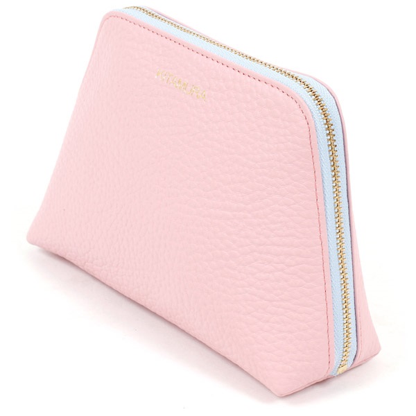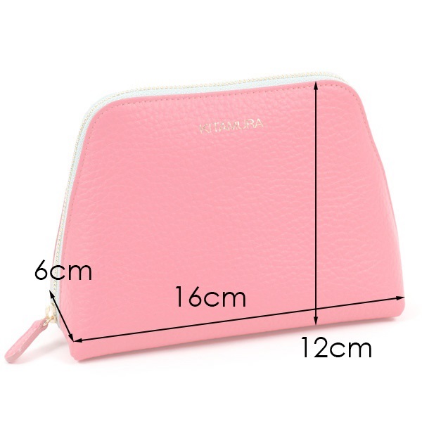 本体とファスナーテープのカラーコンビがポイントの牛革ポーチ。カラーコンビが映えるシンプルなデザインで、前面には箔押しのKITAMURAロゴをあしらいました。やや大きめのサイズ感で、内側には便利な内ポケット付き。