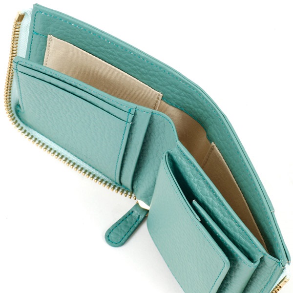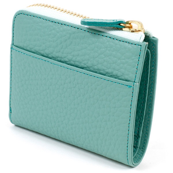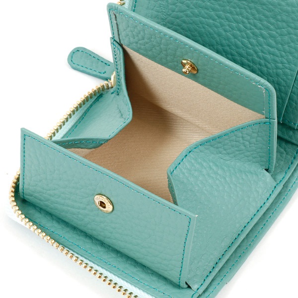 本体とファスナーテープのカラーコンビがポイントの二折財布。カラーコンビが映えるシンプルなデザインで、前面には箔押しのKITAMURAロゴをあしらいました。最低限のカードと、お札、小銭が入るコンパクトなサイズ感で、ミニバッグでのお出かけにもおすすめ。開閉はL字ファスナーで、小銭入れは中身が見やすく取り出しやすいボックスタイプです。