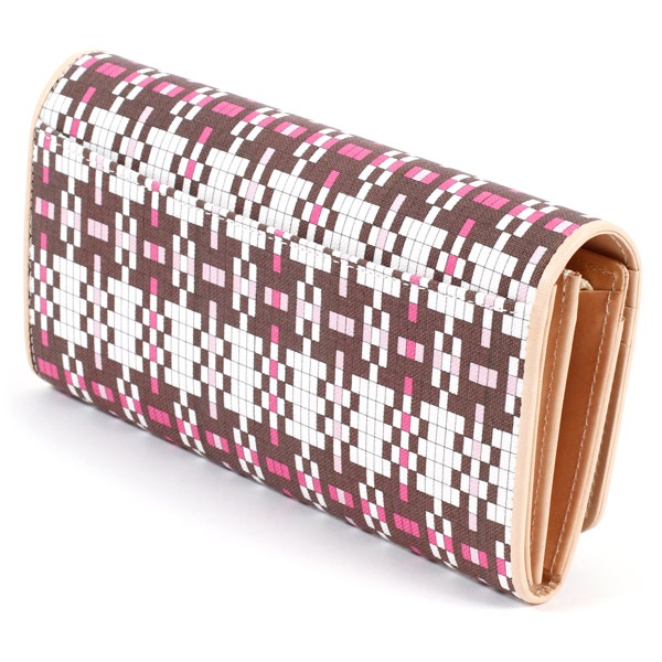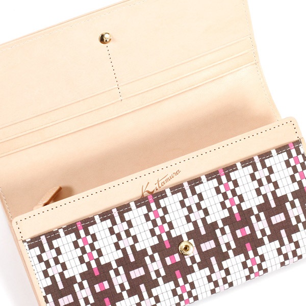 細やかなメッシュ風プリントのキャンバス生地を使用した長財布。縁取りや内装にはヌメ革を使用しており、使うほどに色の深みが増していく経年変化が楽しめます。収納力に優れ、合計16枚のカードが収納可能。小銭入れは大きく開いて見やすいL字ファスナータイプです。