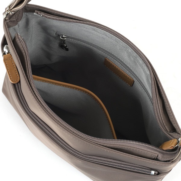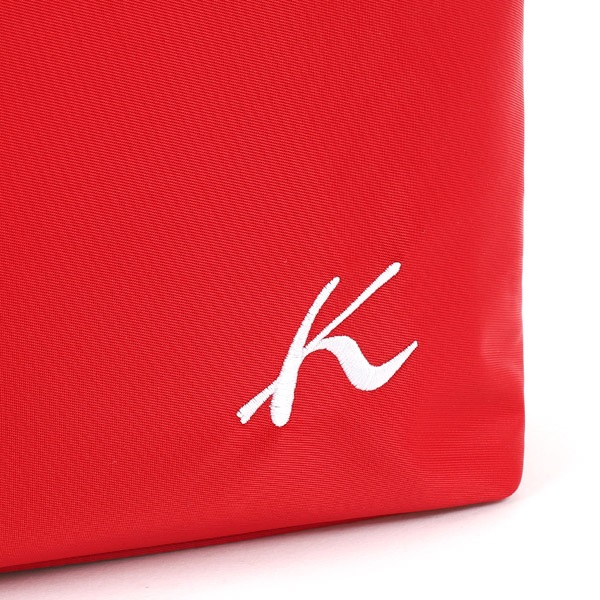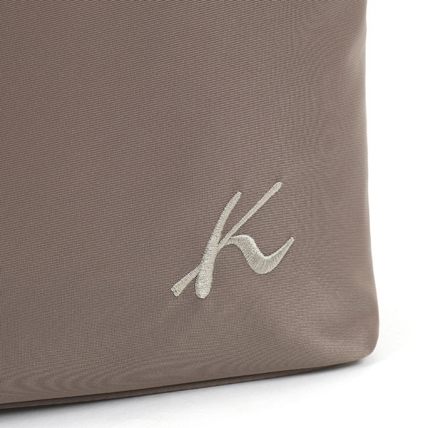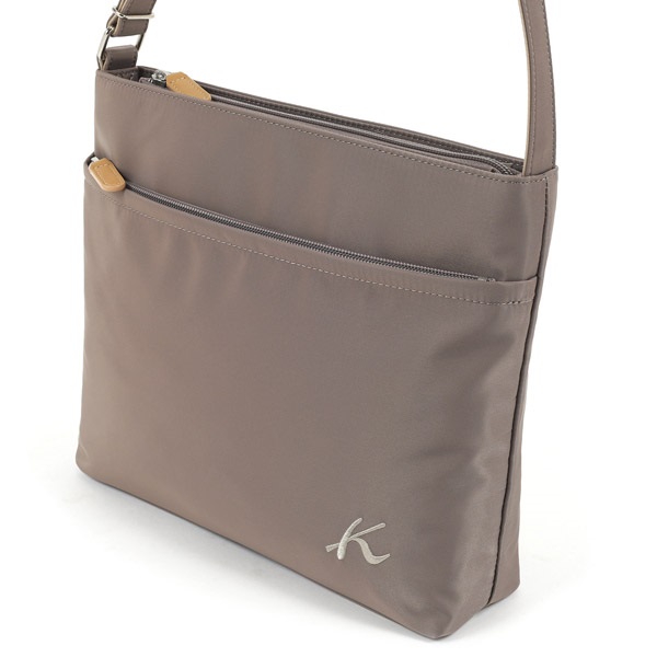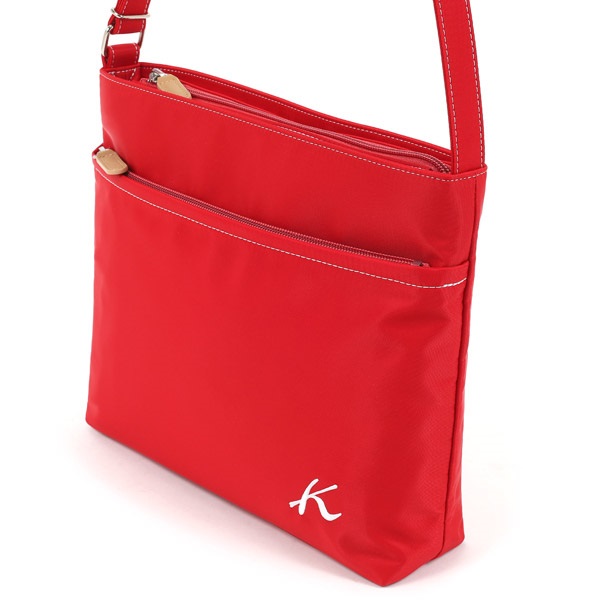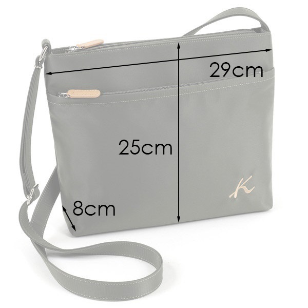 Kマーク刺繍がワンポイントのショルダーバッグ。お財布、スマホ、ポーチ、折りたたみ傘など、荷物がしっかりと収納できるサイズ感です。口元は安心感のあるファスナータイプ。ショルダーの長さは調整することができます。