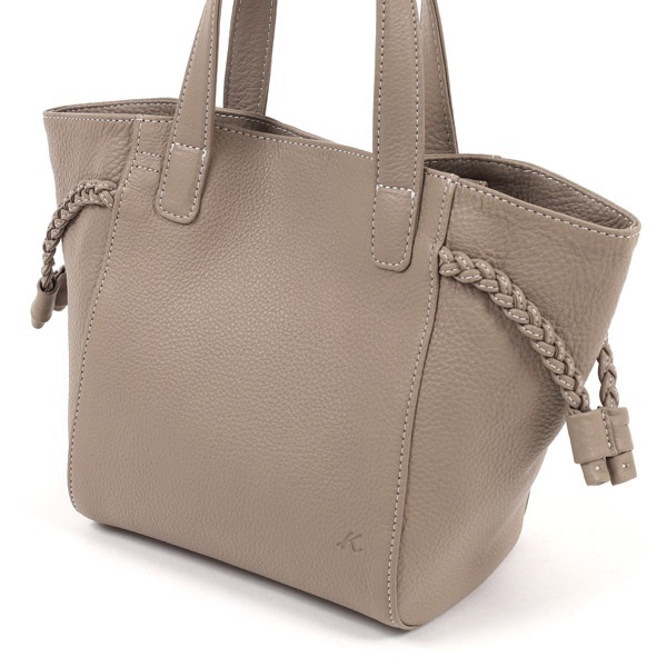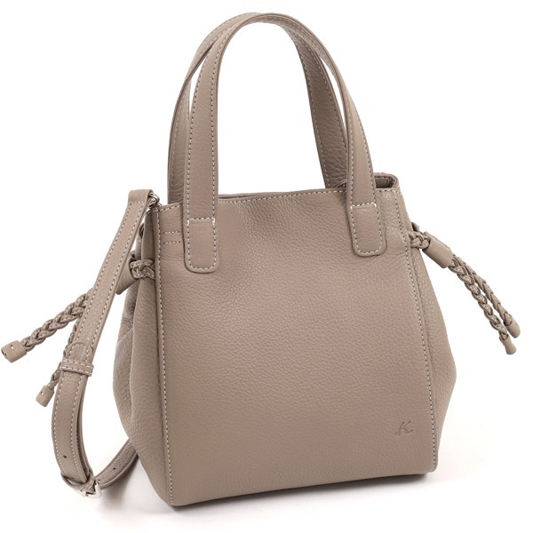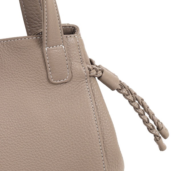 着脱可能なショルダーベルト付きで斜め掛けもできます。サイドの編み紐は絞りを調節でき、荷物の量やコーディネートに合わせてフォルムを変えてアレンジも楽しめます。可愛らしい小ぶりなサイズ感で、デイリー使いにおすすめです。