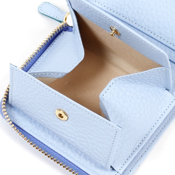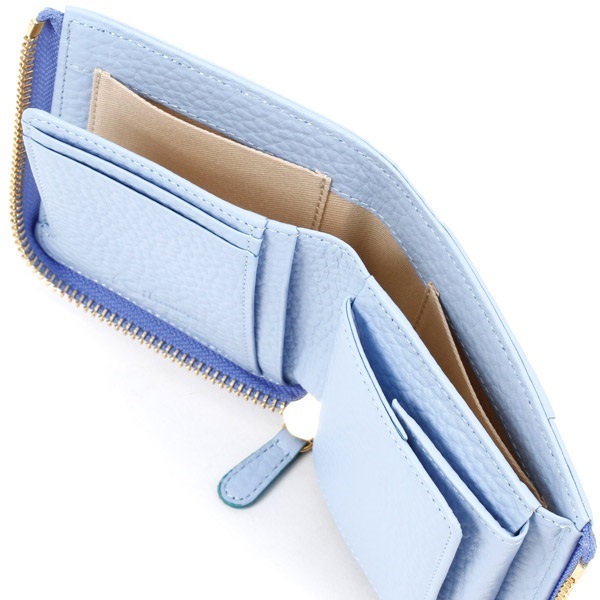 本体とファスナーテープのカラーコンビがポイント最低限のカードと、お札、小銭が入るコンパクトなサイズ感で、ミニバッグでのお出かけにもおすすめ。開閉はL字ファスナーで、小銭入れは中身が見やすく取り出しやすいボックスタイプです。