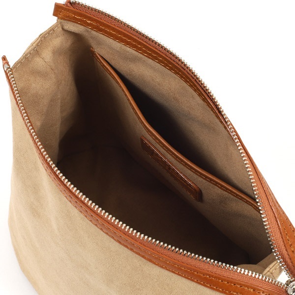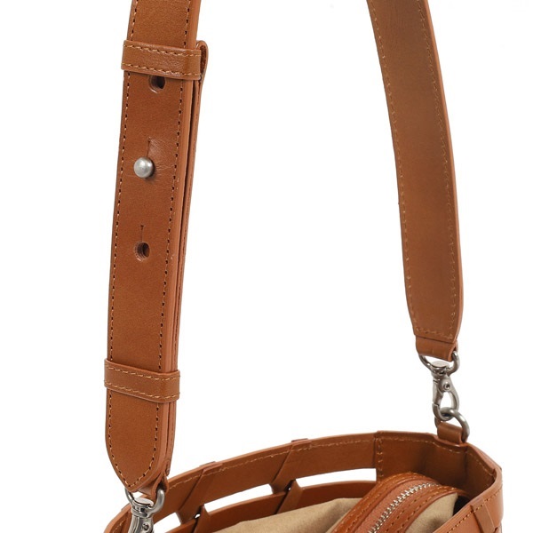 斜めに編んだデザインがポイント。ツヤのある牛革が上品な印象です。取り外しができるスエード調合皮を使用した内袋ポーチが付いており、貴重品の持ち歩きも安心。ショルダーの長さはベルトで調節可能です。カジュアル感ときちんと感がほどよいバランス。