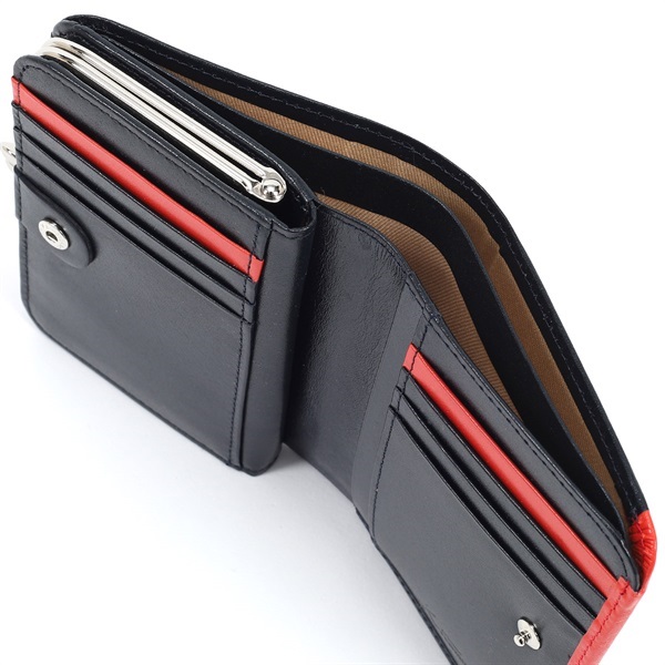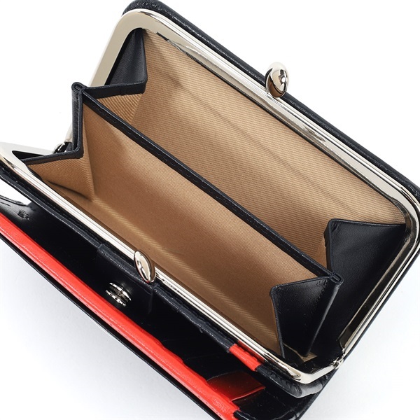 すっきりとしたフォルムが上品な印象です。正面と、カード段の一部にアクセントカラーをプラスしました。手のひらに収まるコンパクトなサイズ感。がま口タイプの小銭入れがチャームポイントです。