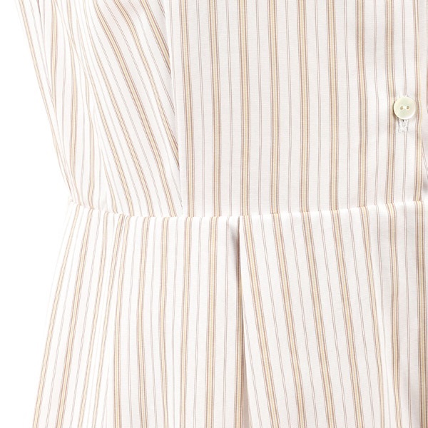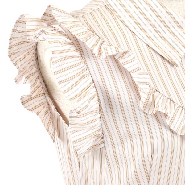 シャツワンピースはストライプ柄のシャツ地に、あえて可愛らしいディテールをプラスし、きちんと感・可愛らしさ・カジュアル感のバランスにこだわったデザインです。スカートは膝がしっかり隠れる丈感。ウエスト切り替え下にタックが入っており、ボリューム感がありつつ、甘すぎないすっきりとしたシルエットです。高めのウエスト切り替えで、スタイルアップ効果も。ウエストのリボンは取り外しが可能で、その日の気分やお好みでアレンジしていただけます。巾着風ハンドバッグは本体にキャンバス地を使用し、軽やかな印象に仕上げました。持ち手のバックルベルトがアクセント。お好みで長さ調節もできます。手書き風キタムラロゴの刺繍が入った革タグは取り外し可能。小ぶりですがマチがあり、見た目以上の収納力があります。
