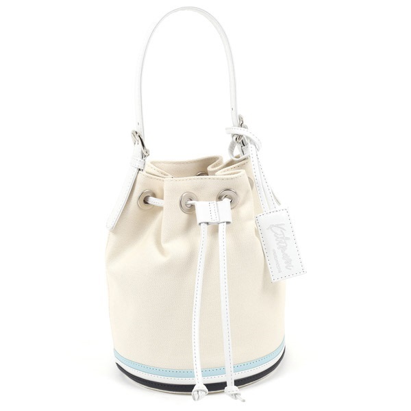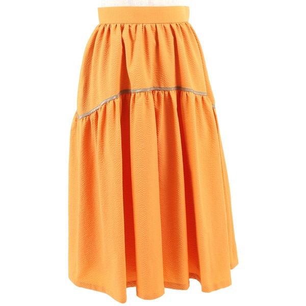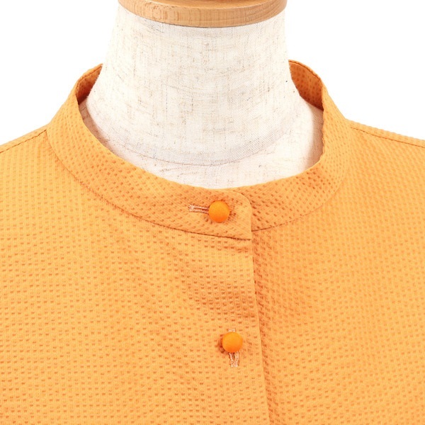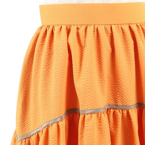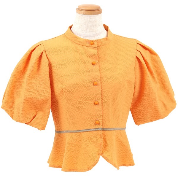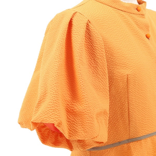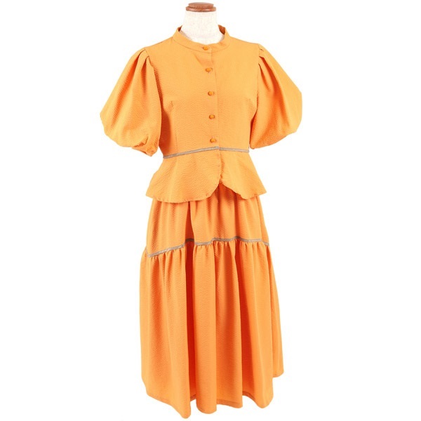 半袖ブラウスはボリュームのあるバルーン袖が可愛らしいデザイン。ストレッチ性があり、さらりとした肌触りで着心地の良いサッカー生地を使用しています。高めのウエスト位置にあしらった別布のパイピングは、ウエストまわりをすっきりと見せてくれる効果も。裾はふわりと広がったペプラムになっており、後ろから見たときの美しいシルエットもポイント。同素材のスカートはウエストベルトと切り替えにギャザーをたっぷりと入れ、ボリューム感のあるシルエットに仕上げました。動いたときにふわっと広がり、可愛らしさと華やかさをプラスしてくれます。サイドにポケットが付いているのも機能的で嬉しいポイントです。巾着風ハンドバッグは本体にキャンバス地を使用し、軽やかな印象に仕上げました。持ち手はお好みで長さ調節もできます。小ぶりですがマチがあり、見た目以上の収納力があります。