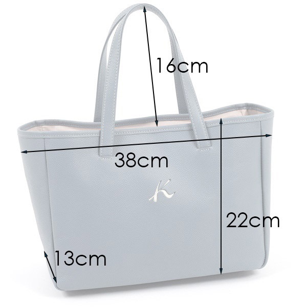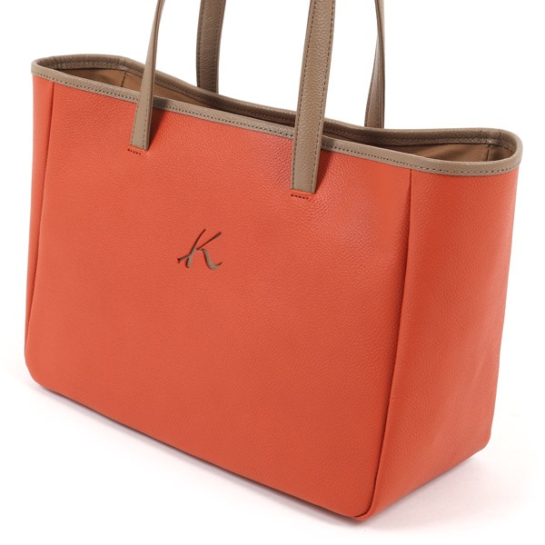 Kマークがワンポイントのシンプルなハンドバッグ。本体と持ち手のカラーコンビがアクセントです。型押しシュリンクを使用しており、キズが目立ちにくいのも嬉しいポイント。内ポケットも充実しており、デイリー使いにおすすめです。