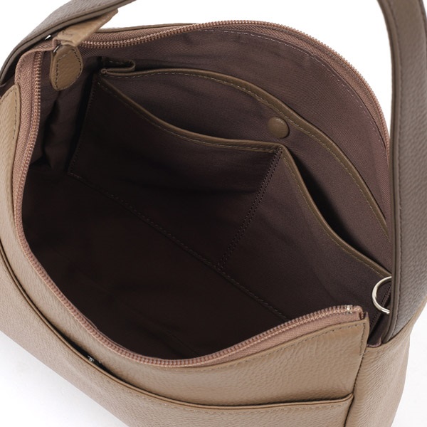 Kマーク入りのタグがワンポイントの2wayセミショルダーバッグ。着脱できるショルダーベルトが付いています。普段使いに便利なサイズ感。背面側の外ポケットはマグネット付きで、パスケースやハンカチ、スマホなど出し入れの多い小物の収納に便利です。