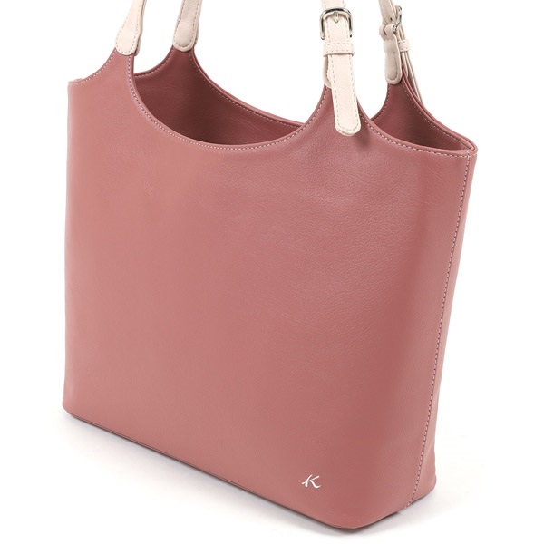 ベルトデザインの持ち手がアクセントのA4対応セミショルダーバッグ。持ち手のベルトで長さ調節もできます。前面の右下にさり気なくKマーク刺繍をあしらいました。内装はあおりタイプになっており、貴重品はメインファスナーの中に、出し入れの多いスマホやパスケースなどはあおりポケットに入れるなど、収納スペースも充実。合皮を使用しているので、雨の日も気兼ねなくお使いいただけます。