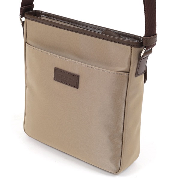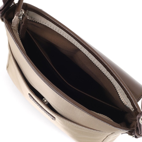牛革×ナイロンコンビのショルダーバッグ。カジュアルなナイロン素材に、牛革が洗練された上品さをプラスしています。ナイロンをメイン素材にすることで、軽い仕上がり。長時間の使用でも肩が疲れにくいため、アクティブなお出かけにぴったりです。裏面の外ポケットは、スマホやパスケースなど、必要な時にすぐに取り出したい小物の収納に便利です。