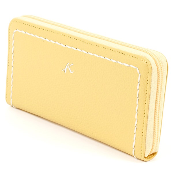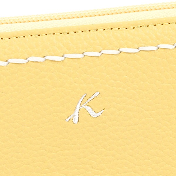 シボ感となめらかな手触りが特徴のシュリンクレザーを使用したラウンド型長財布。目の大きいステッチの縁取りと、刺繍のKマークがアクセントになっています。内側のポケットは3層に分かれており、カードポケットも豊富で収納力抜群。機能性にもこだわりました。