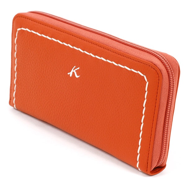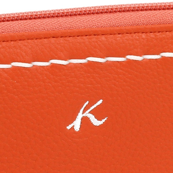 シボ感となめらかな手触りが特徴のシュリンクレザーを使用したラウンド型長財布。目の大きいステッチの縁取りと、刺繍のKマークがアクセントになっています。内側のポケットは3層に分かれており、カードポケットも豊富で収納力抜群。機能性にもこだわりました。