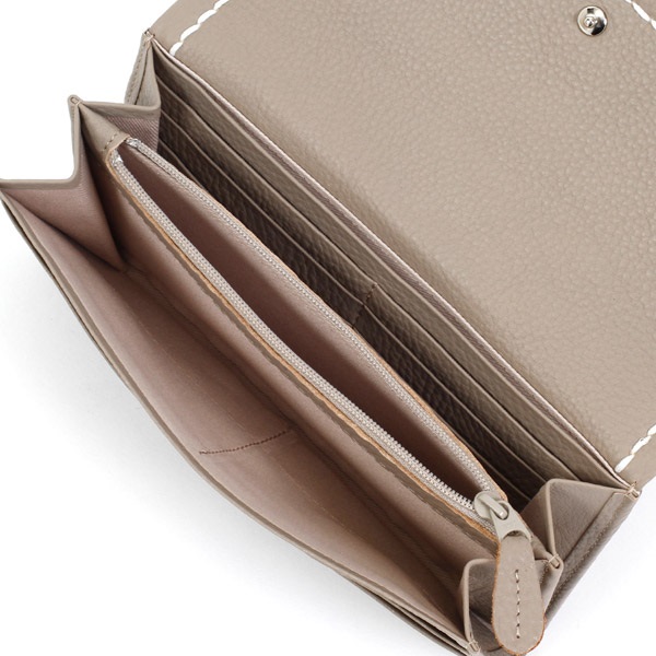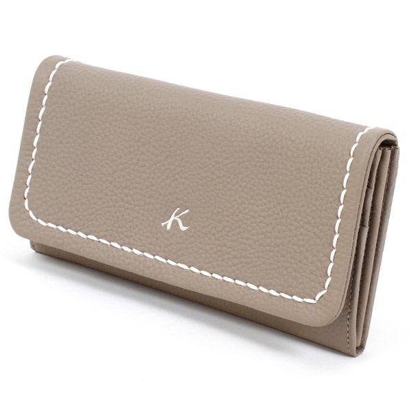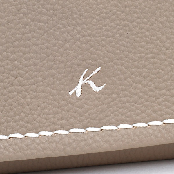 シボ感となめらかな手触りが特徴のシュリンクレザーを使用したかぶせ型長財布。目の大きいステッチの縁取りと、刺繍のKマークがアクセントになっています。すっきりとした内装で、コンパクトに持ち運びできます。