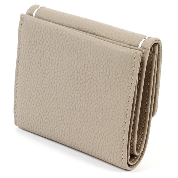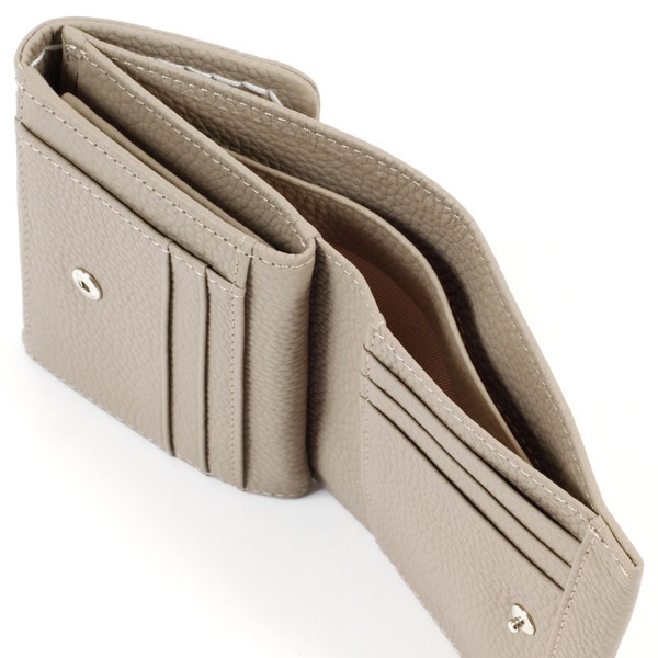 シボ感となめらかな手触りが特徴のシュリンクレザーを使用した二折財布。目の大きいステッチの縁取りと、刺繍のKマークがアクセントになっています。小銭入れは2層に分かれており、仕切り部分もポケットになっています。
