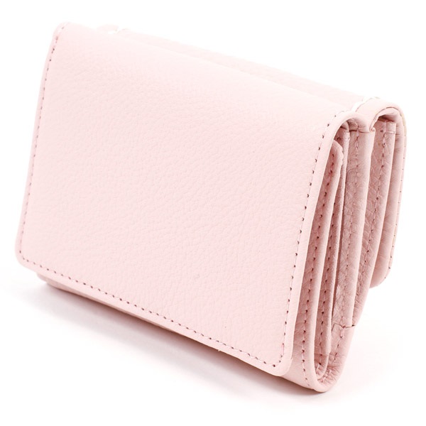 シボ感となめらかな手触りが特徴のシュリンクレザーを使用した三折財布。目の大きいステッチの縁取りと、刺繍のKマークがアクセントになっています。手のひらに収まるコンパクトなサイズ感で、お札も折らずに持ち運べます。
