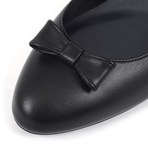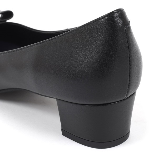 撥水機能を兼ね備えたシンプルな牛革ローヒールパンプス。立体的なプチリボンが上品な可愛らしさをプラスします。3.5cmのスクエア型ヒールで安定感のある履き心地。足裏の当たりがよいクッション入りの中敷きを使用しています。濃色の中敷きは、靴を脱ぐシーンで汚れが気にならないのもポイント。オケージョンシーンにもおすすめの一足です。