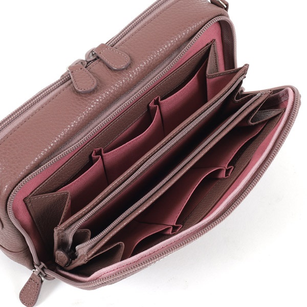 やわらかい質感のシュリンク牛革でお作りしたポシェット。お札・小銭・カード・スマホ・通帳・ポーチなどの小物をコンパクトに持ち歩けます。たっぷりとしたマチのあるスクエアフォルムが特徴で、収納力があります。ショルダー紐は着脱でき、ポーチとしてもお使いいただけます。普段使いはもちろん、ご旅行にもおすすめです。
