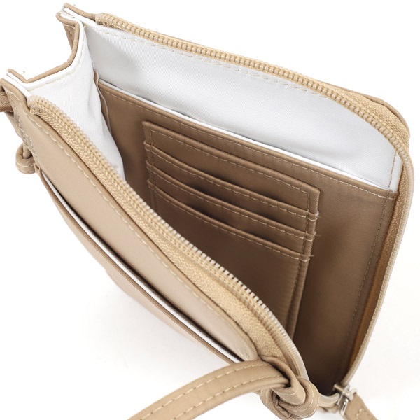 収納スペースが充実したコンパクトなスマホショルダーバッグ。軽量でハリ感のあるナイロン素材を使用しています。口元はL字ファスナーで出し入れしやすく、ポケットは外側に2つ、内側はポケット2つとカード段が付いています。スマホ以外にもパスポートやカードも収納でき、普段使いはもちろん、トラベルシーンにもおすすめです。