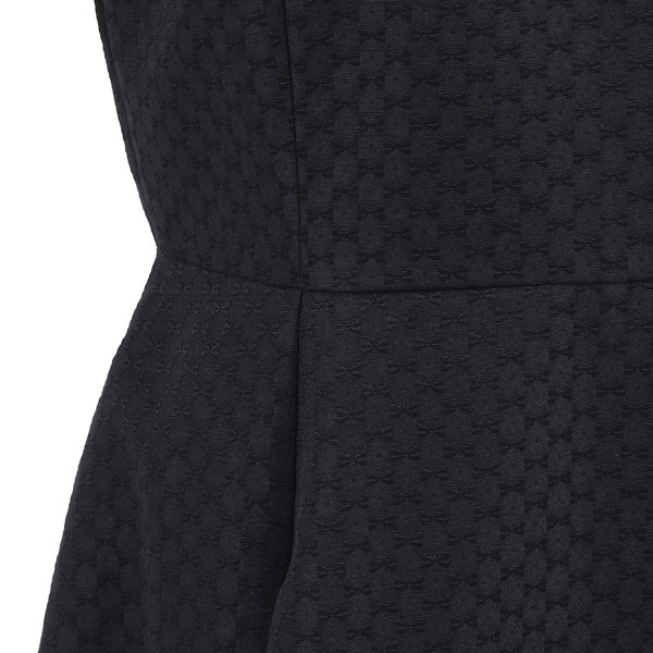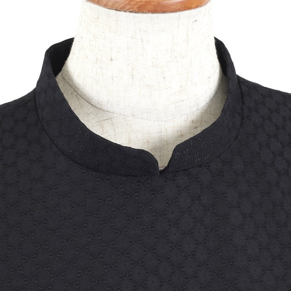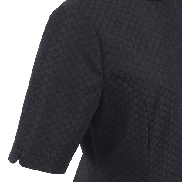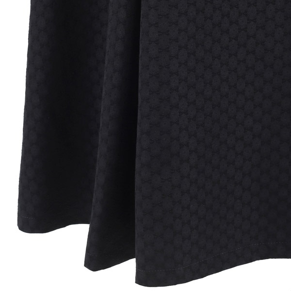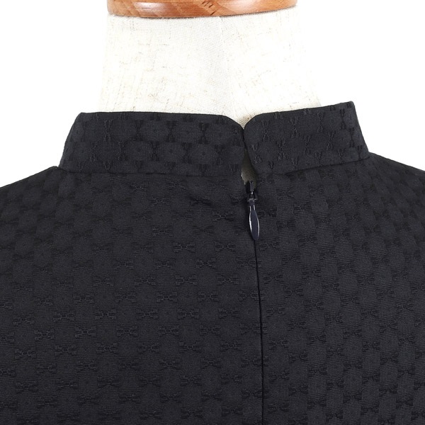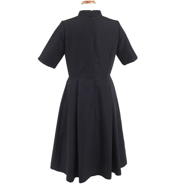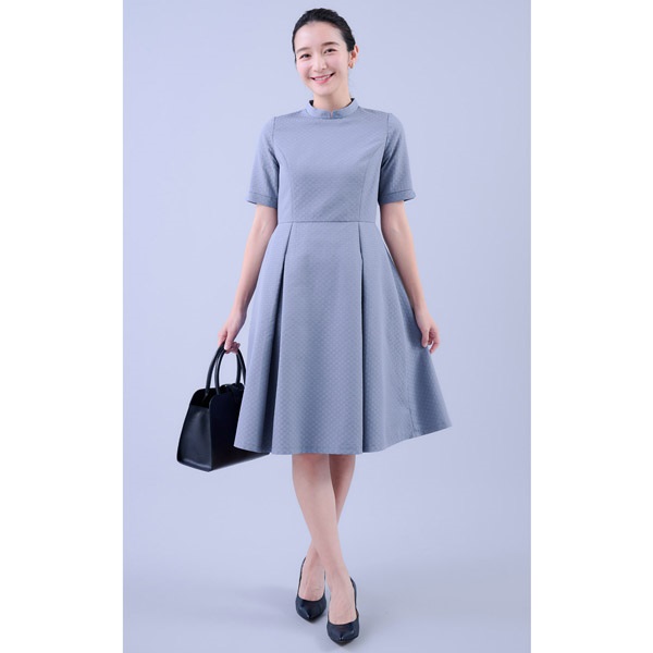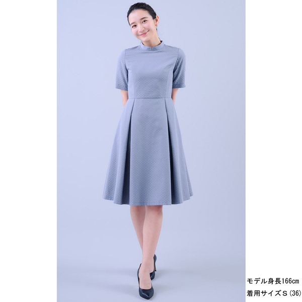 さり気ないリボン柄のドビータフタ素材を使用した半袖ワンピース。素材の特長を活かしたシンプルなデザインに仕上げました。首元のスタンドカラーでスパイシーさをプラス。スカートは大きめのタックを入れたボックスデザインで、広がりすぎない程よいボリューム感に。ヒールでもフラットシューズでも、バランス良く見える丈感にこだわりました。高めのウエスト位置でスタイルアップも叶います。袖は細身シルエットでカーディガン等も羽織りやすく、ロングシーズン着用していただけます。オケージョンシーンにもおすすめです。