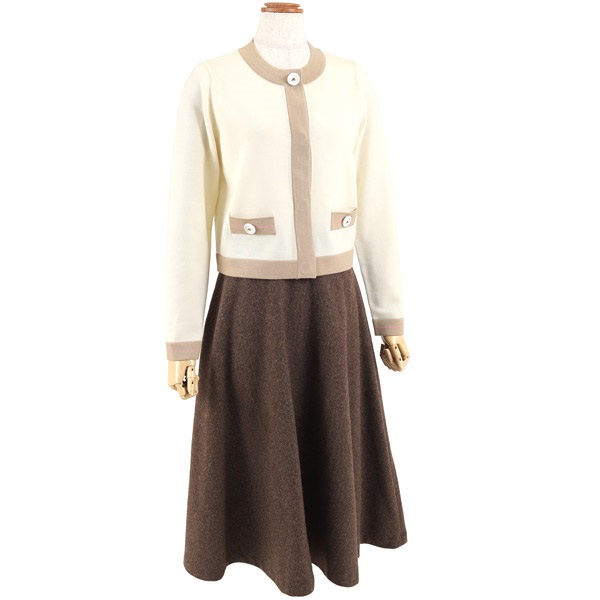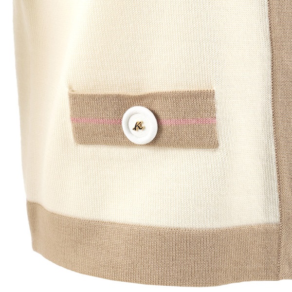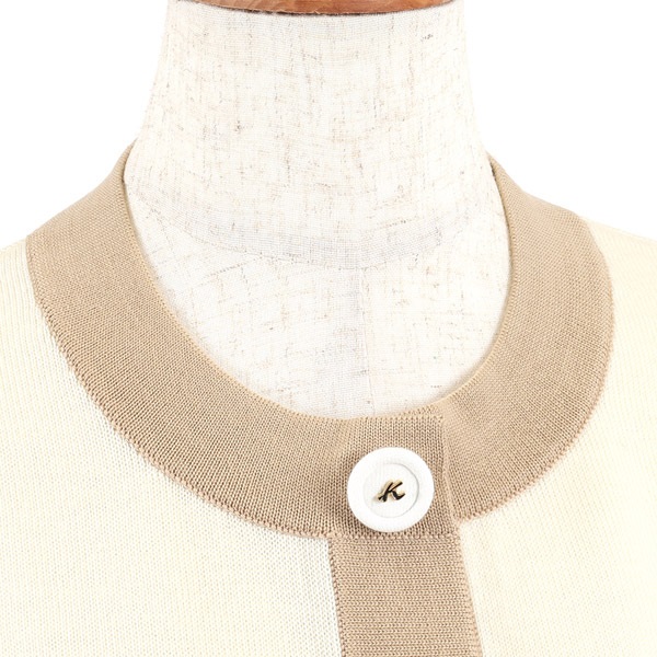 配色デザインがポイントのニットカーディガン。Kマークの金具が埋め込まれたキタムラオリジナルボタンを使用しています。ややゆったりとしたシルエットで、ウール糸を贅沢に使用し密度を高めているため、ジャケット風にも着用していただけます。スカートやワンピースはもちろん、デニム等のカジュアルアイテムまで幅広くコーディネートしていただけます。