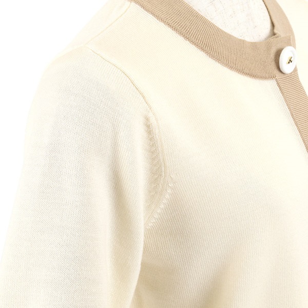 肌触りが非常になめらかで、チクチク感が少ないエクストラファインメリノウールを使用。保温性と吸湿性にも優れ、快適な着心地です。カーディガンとしては厚地な2本取りの糸を使用しており、目の詰まった、しっかりとした生地感が特長です。