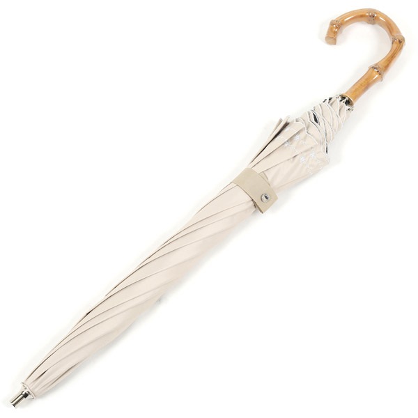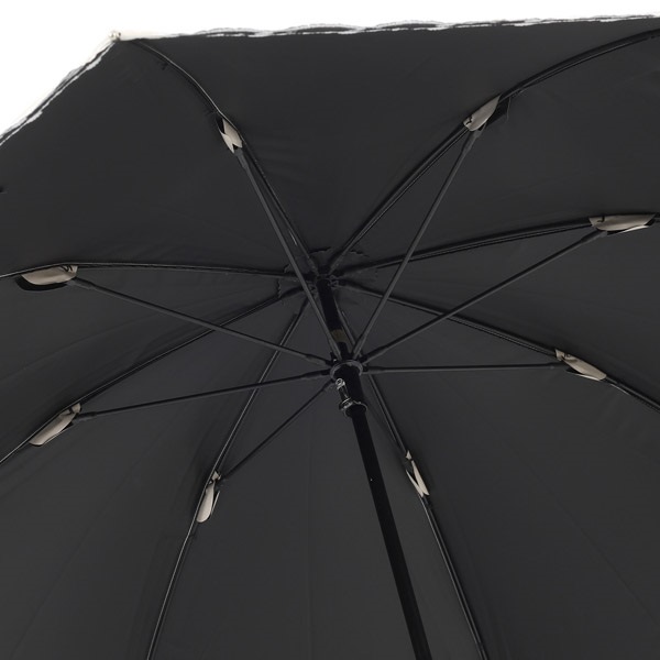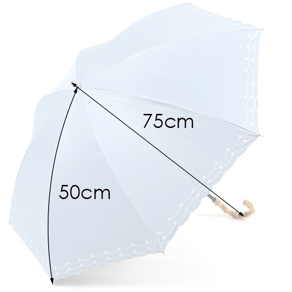 スカラップカットの縁取りがアクセントのショート晴雨兼用 日傘。繊細なお花の刺繍が上品なかわいらしさ添えます。内側と中骨のカラーにはブラックを使用。持ち手には、軽量かつ丈夫なバンブー素材を使用しました。