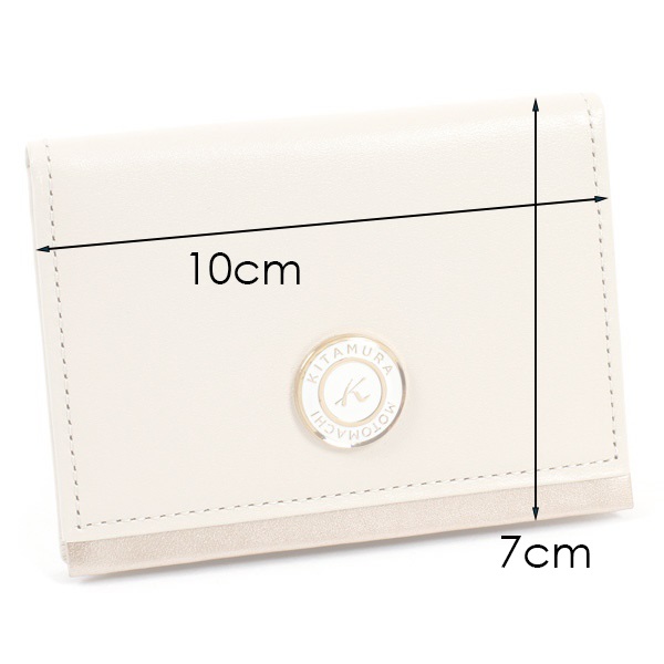 ツヤとハリのある牛革でお作りしたパスケース。「KITAMURA MOTOMACHI」の文字に囲まれたKマークの飾りがポイントです。かぶせの下と、カード段の一部にアクセントカラーをプラスしました。内側と外側の2面がパス窓になっています。