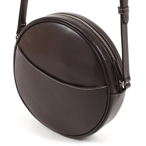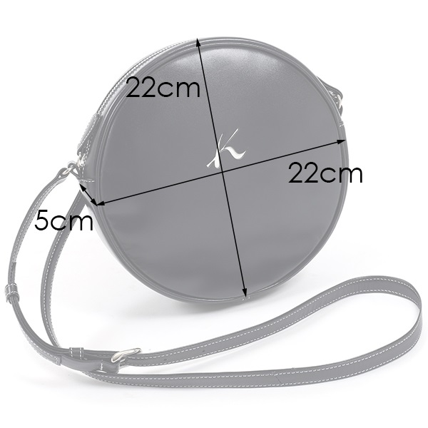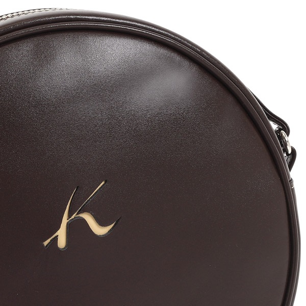 クラシックな雰囲気の丸型ショルダーバッグ。角のないやさしいフォルムに、抜きのKマークがワンポイントになっています。ツヤ感のあるスムースタイプの牛革が上品な印象。本体は薄マチですが、長財布も収納できます。背面には大きめのオープンポケットが付いており、スマホやハンカチなど、サッと取り出したい小物の収納に便利です。