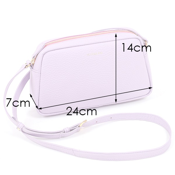 本体とファスナーテープのカラーコンビがポイントのショルダーバッグ。カラーコンビが映えるシンプルなデザインで、前面には箔押しのKITAMURAロゴをあしらいました。薄マチで、身体に沿うすっきりとしたフォルム。小ぶりなサイズ感ですが、長財布も入ります。