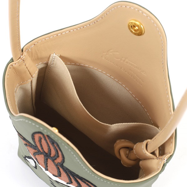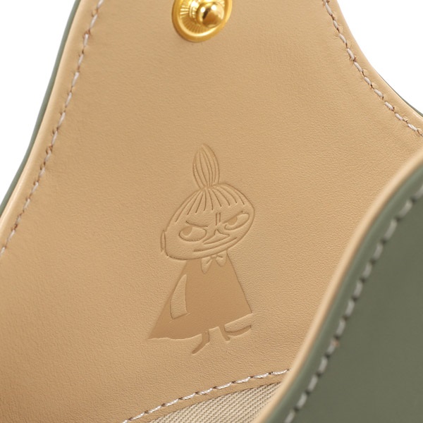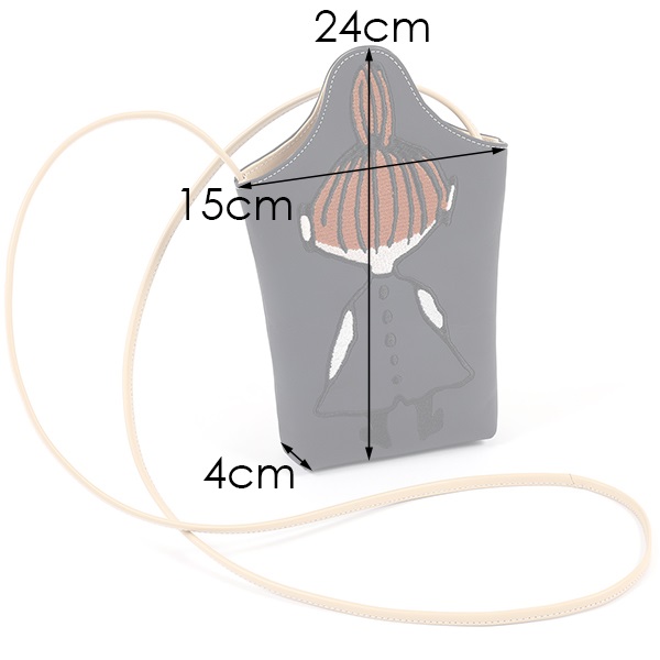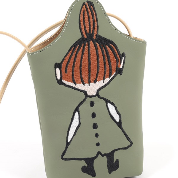 リトルミイの後ろ姿を刺繍で大胆にあしらったショルダーバッグ。特徴的なおだんご頭のシルエットをいかしたフォルムに仕上げました。内装には、さり気なくリトルミイの全身像が素押しで入っています。バッグの裏面には外ポケットが付いており、パスケースやハンカチなど、サッと取り出したい小物の収納に便利。ショルダー紐は中の結び目で調整できます。お揃いの二折財布(PH0826)が収納可能なサイズです。