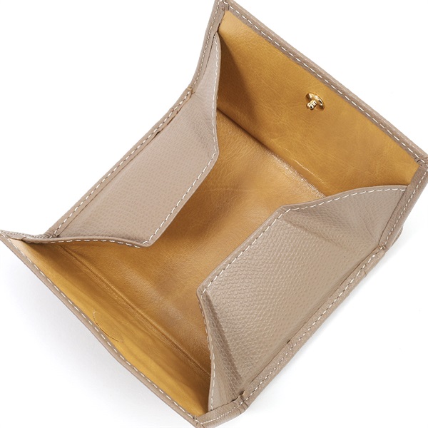 すっきりとしたシンプルなデザインの小銭入れ。キズが目立ちにくい型押しを施した牛革でお作りしました。お札を半分に折りたためば中央のポケットに収納できます。コンパクトで、カードポケットも付き機能的です。