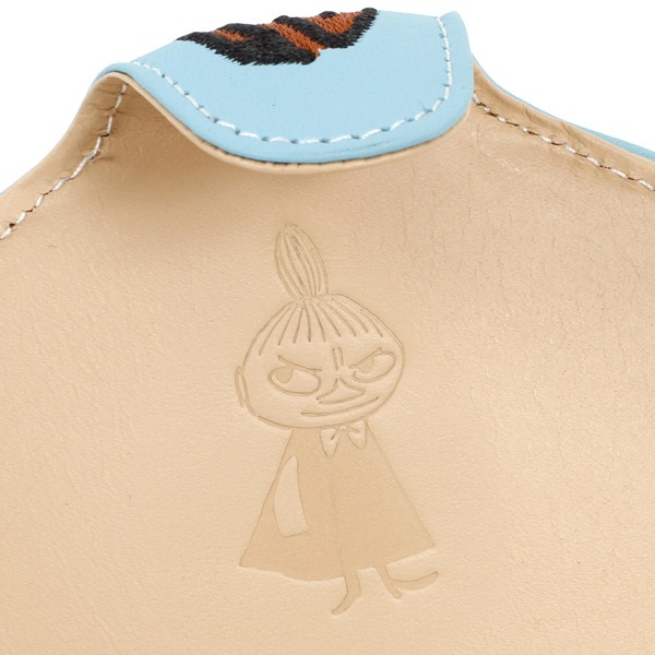 リトルミイの後ろ姿を刺繍で大胆にあしらった二折財布。特徴的なタマネギ型のおだんご頭を、お財布のホック部分のシルエットに見立てました。まるでリトルミイがでんぐり返ししているようなユーモアのあるデザイン。小銭入れは立体的に開くボックスタイプで機能的です。内装にはリトルミイの全身像を素押しであしらいました。
