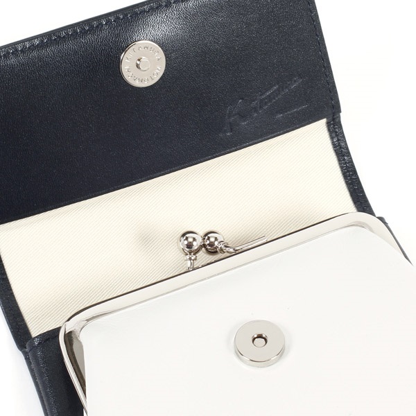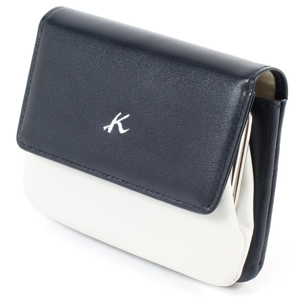袋縫いの仕立てが優しい印象の二折財布。ふっくらとした触り心地で、がま口の小銭入れを包み込むようなかぶせが特徴です。カード類やたたんだお札は内ポケットに収納可能。かぶせ裏にもポケットが付いており、レシート、クーポンなどを分けて収納できます。かぶせのKマーク刺繍がワンポイント。カラーコンビが可愛らしく、バリエーション豊富で選ぶ楽しさが広がります。