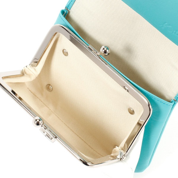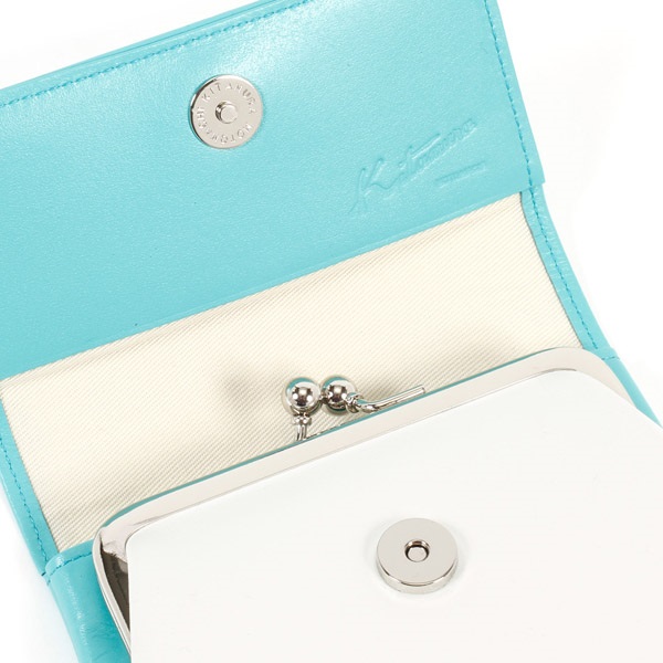 袋縫いの仕立てが優しい印象の二折財布。ふっくらとした触り心地で、がま口の小銭入れを包み込むようなかぶせが特徴です。カード類やたたんだお札は内ポケットに収納可能。かぶせ裏にもポケットが付いており、レシート、クーポンなどを分けて収納できます。かぶせのKマーク刺繍がワンポイント。カラーコンビが可愛らしく、バリエーション豊富で選ぶ楽しさが広がります。
